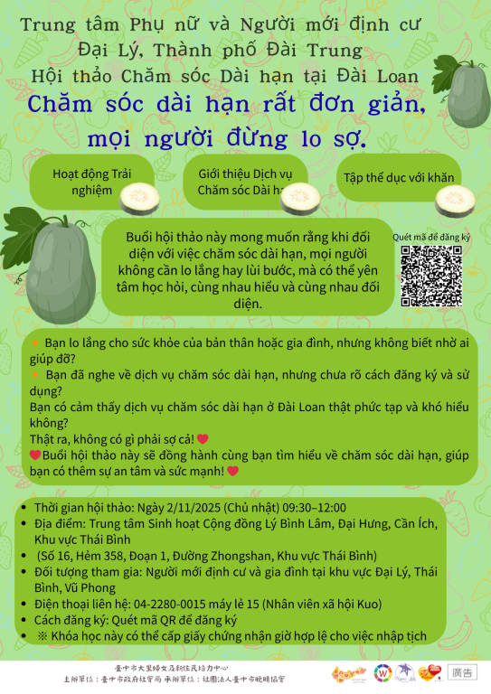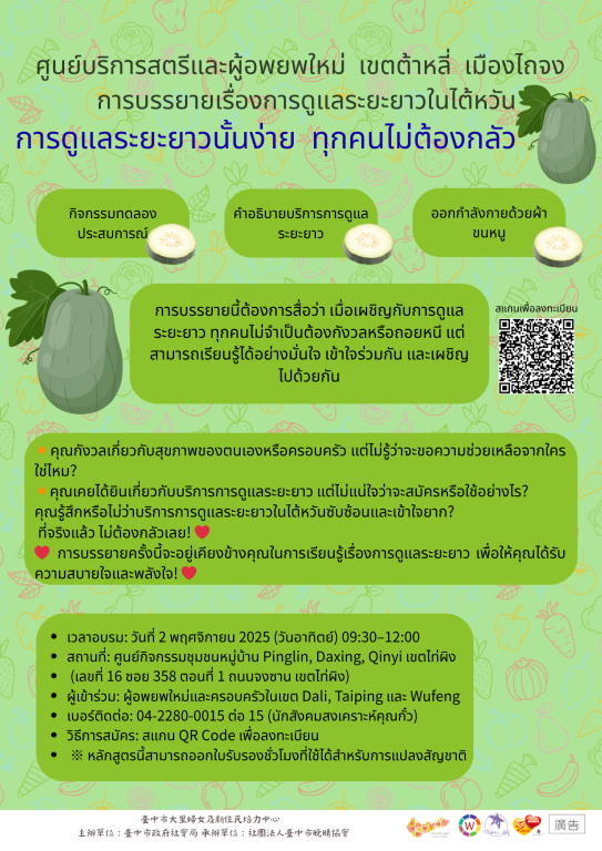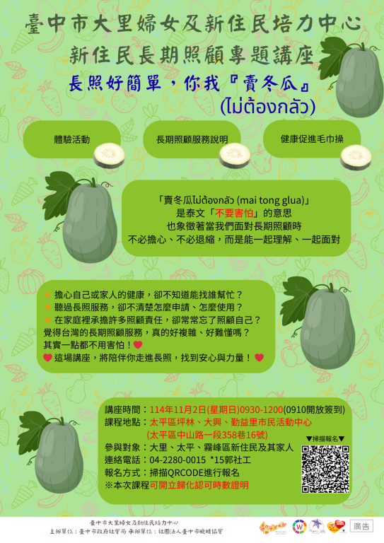 👵👴 長照好簡單,你我賣冬瓜(ไม่ต้องกลัว) 👵👴新住民長期照顧專題講座 (其中「ไม่ต้องกลัว」在泰文中意為「不要害怕」,