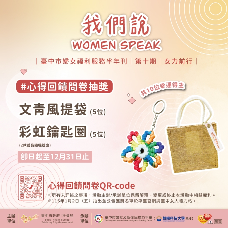 📌獲獎及領取方式:活動截止日後,於115年1月2日(星期五)抽出並公告10位獲獎者,於平臺官網與【臺中女人培力站】Facebook粉絲專頁,請獲獎者私訊或電話聯絡平臺,並留下正確通訊資料,我們將郵寄獎品給您!🎉(如1/9(星期五)23:59前未回應,視為放棄資格)