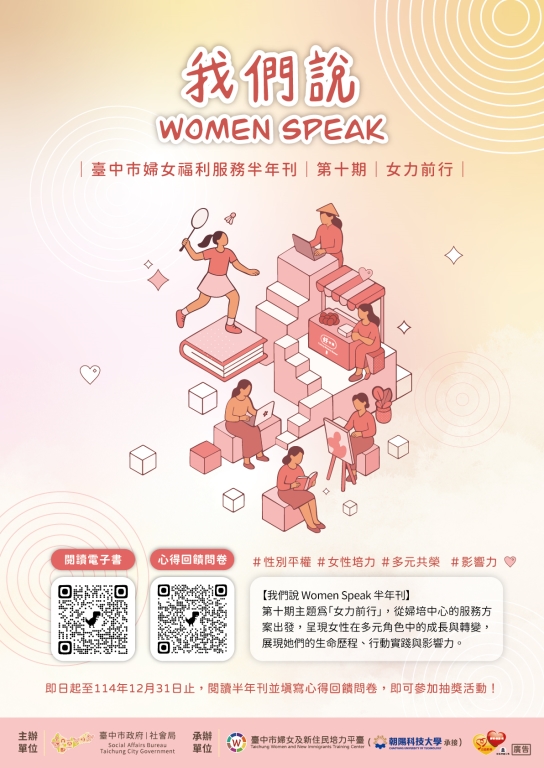 【我們說 Women Speak 半年刊 】第十期主題為「女力前行」,從婦培中心的服務方案出發,呈現女性在多元角色中的成長與轉變,展現她們的生命歷程、行動實踐與影響力。
